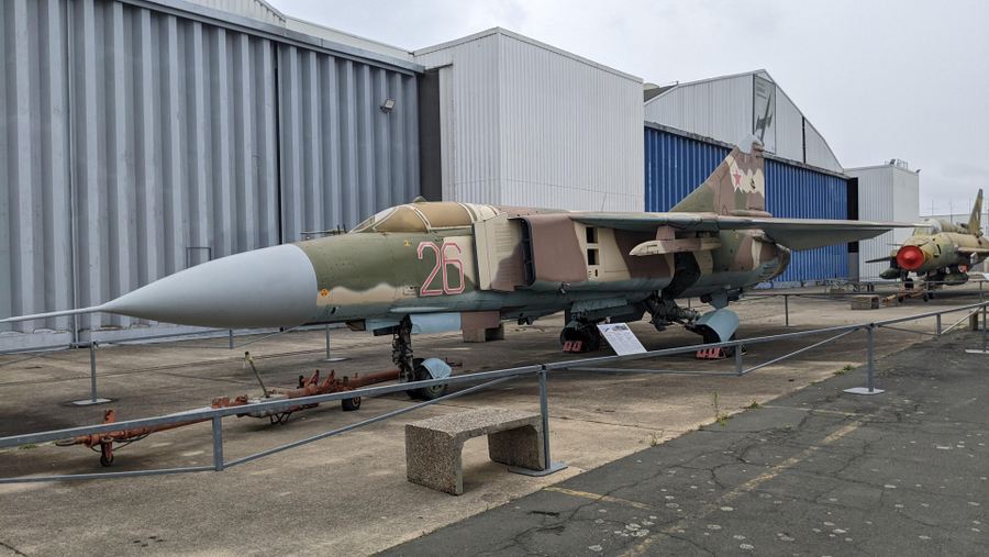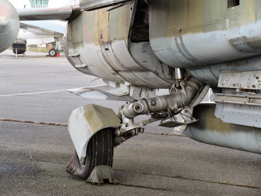 There’s a Mikoyan-Gurevich MiG-23 ML (NATO name ‘Flogger’), the Mach 2, variable-wing successor to the MiG 21. It first flew in June 1967 and thereafter was manufactured in huge numbers (5,800) and exported to over thirty countries. This aircraft was in the East German air force. One thing I’ve always liked about the Mig-23 is the big chunky bent-leg undercarriage. I doubt much change was needed for the MiG-23 K carrier variant. Those legs look like they could take a real pounding!