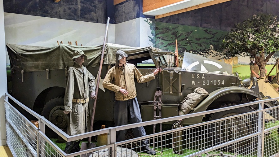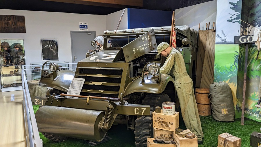 Speaking of vehicles, it’s easy to forget that around 80% of the German Army in WW2 was horse-drawn, as it had been in WW1. Hitler, Goebbels and the military always sought to project the image of a modern mechanised army, which is why German photographs and film footage rarely show horses pulling carts and guns. One of the dioramas pays attention to that aspect by showing a farrier in his mobile workshop. Needless to say, there weren’t many/any farriers among the US service corps.