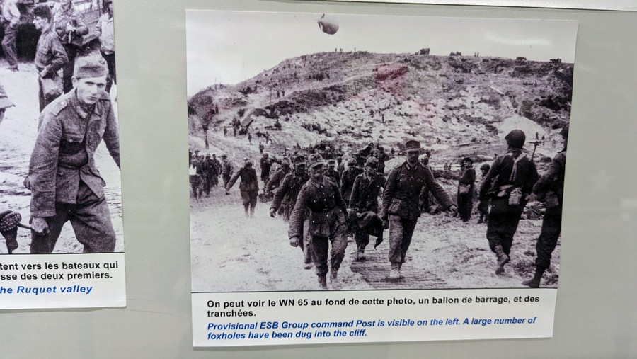 The display at the Omaha Beach Memorial Museum has pages from the Operation Aquatint after action report, photographs, and a summary of “Lessons Learnt and Notes for Future Consideration” compiled by Sgt I.G. Collins. What brought me to a screeching halt when I read it was bullet point No. 8: “The navigation throughout seems to have been excellent”. WHAT?! Instead of the sleepy little beach 6¼ kms away, they had landed right in front of the Atlantic Wall strongpoint (Wn 68) under construction to defend the draw from a possible future invasion! How was that ‘excellent navigation’?