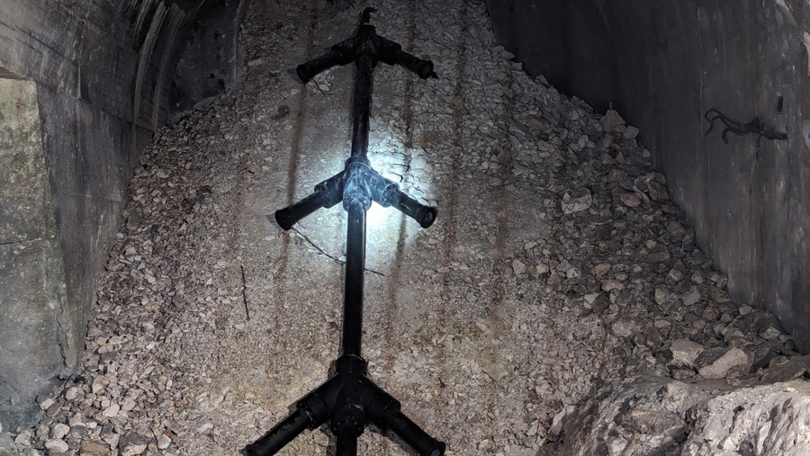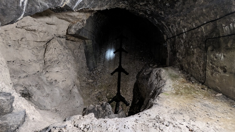 The entrance looks just as discreet and insignificant as it tried to be in 1944, but behind it is the enormous 650m train tunnel which disappears off into the distance (feature photo). The last 150m and the northern entrance to the rail tunnel are collapsed, as are the adjacent service tunnels at the northern end.
