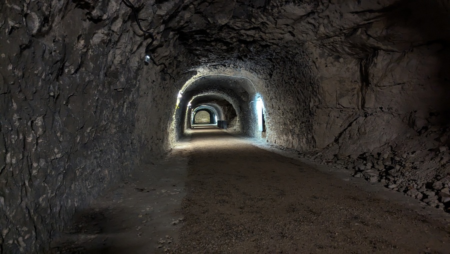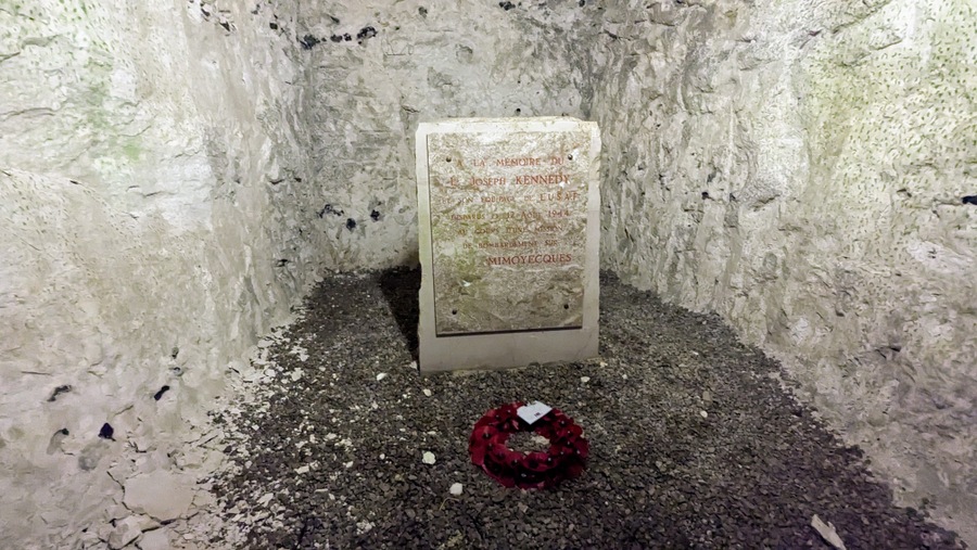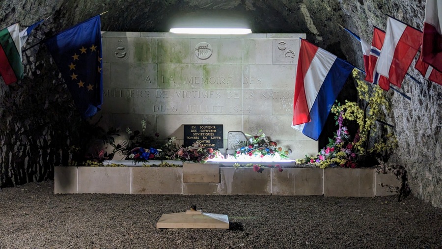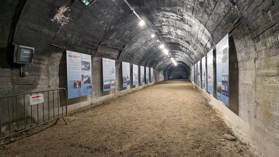 Essentially a guided or self-guided tour will take you along the main rail tunnel, then left down one of the service tunnels leading to the gun shafts, returning to the main tunnel through another service tunnel. Along the way there are plenty of information panels (in multiple languages) and a some memorials, one to the allied airmen who died attacking the site, one to the victims (Todt organisation workers from 18 countries) of the Tallboy raid on 6 July 1944, and a small memorial stone to Joseph Kennedy and his crewmate, Lt. Wilford Willy, who died on the Anvil operation.