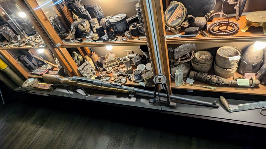 There are two sections: the ‘Battle Room’ is the main gallery, where the path wraps around a central display area where much of the weapons and wreckage dug up in the surrounding fields is displayed. Around the walls are maps, photos, info panels, and display cabinets with uniforms, weapons, medical equipment, bottles and tins, and other personal effects.