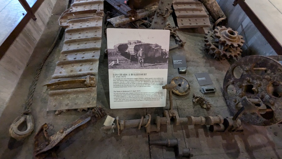 At one end of the trench of wreckage there’s the rusty remains of track, gear wheels, and a crankshaft from Tank No. 799, which had been disabled by enemy gunfire, early in the battle on 11 April.