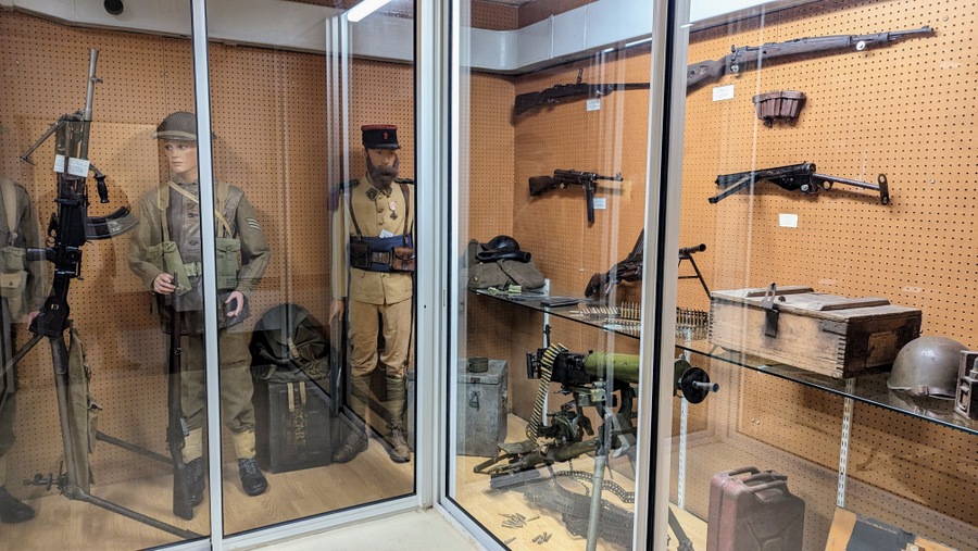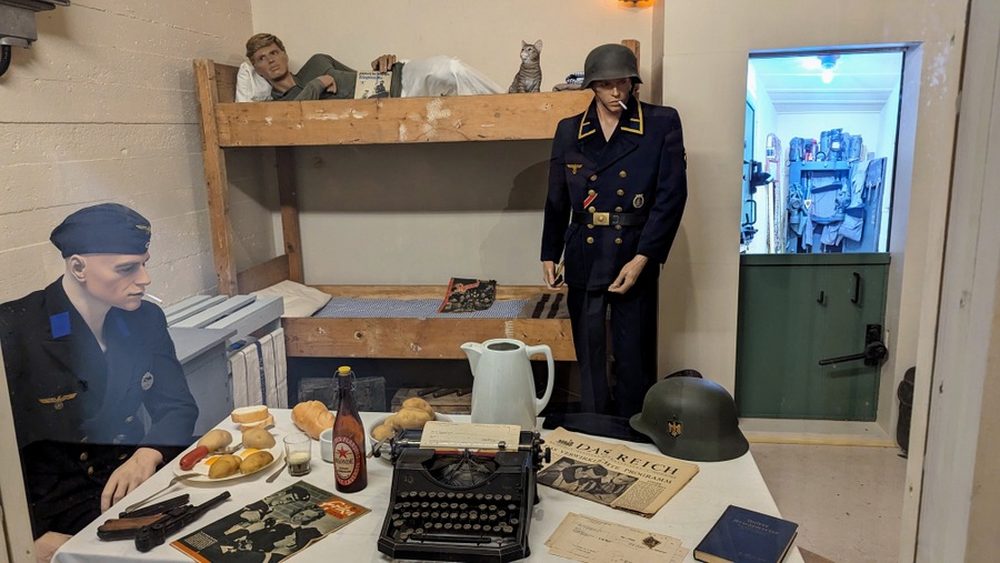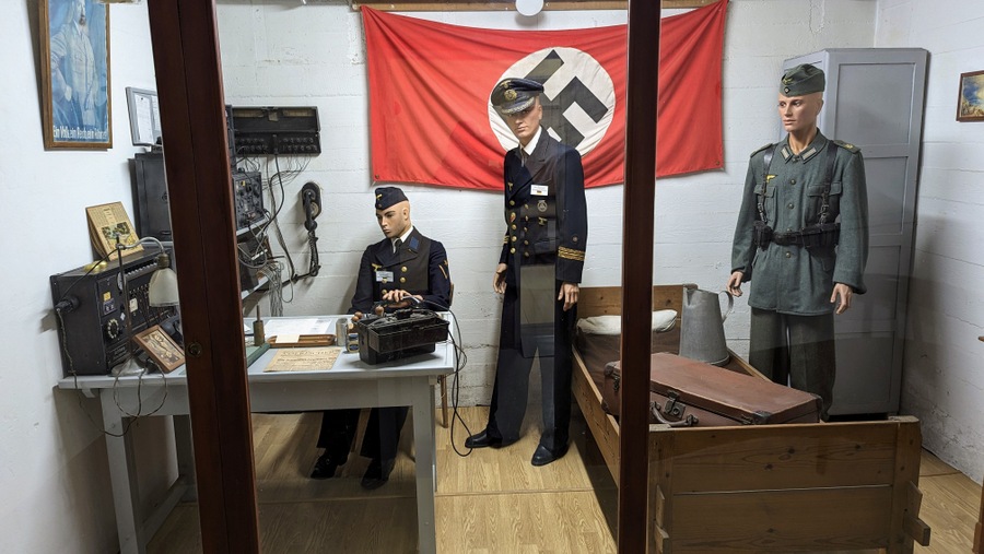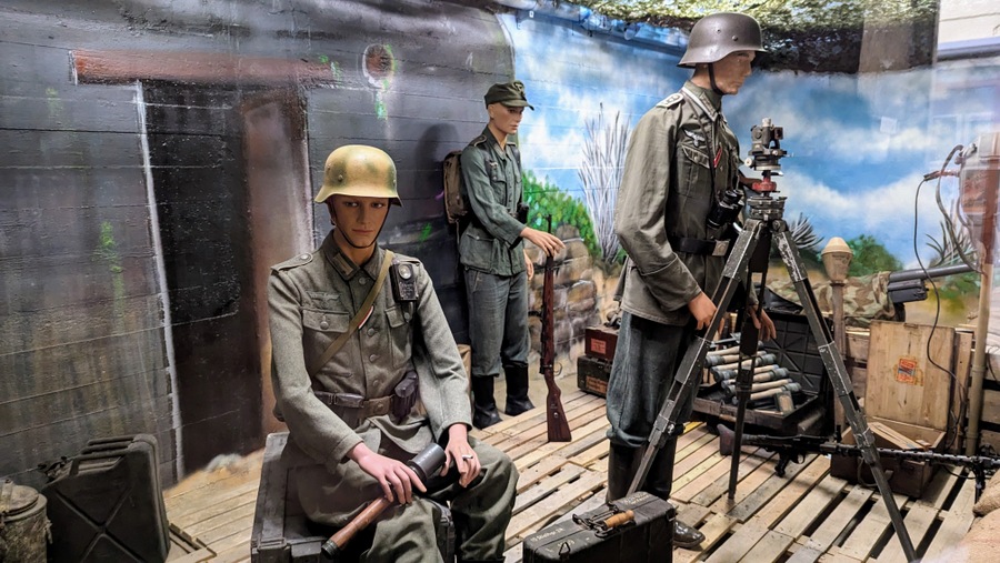 Several rooms display mannequins in uniforms (over 60 of them) from different armies, together with small arms and ammunition. In common with many museums there are also some simple dioramas showing Germans in their bunkers, including this one…