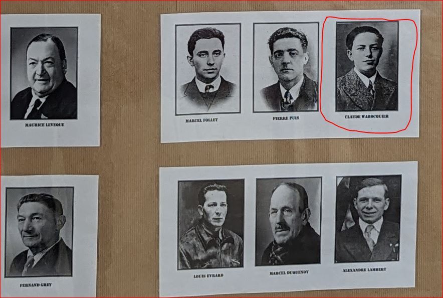 Among the photos is 20-yr-old Claude Waroquier. Nearby are recreations of two letters he wrote to his parents from prison in Paris in Oct 1943…