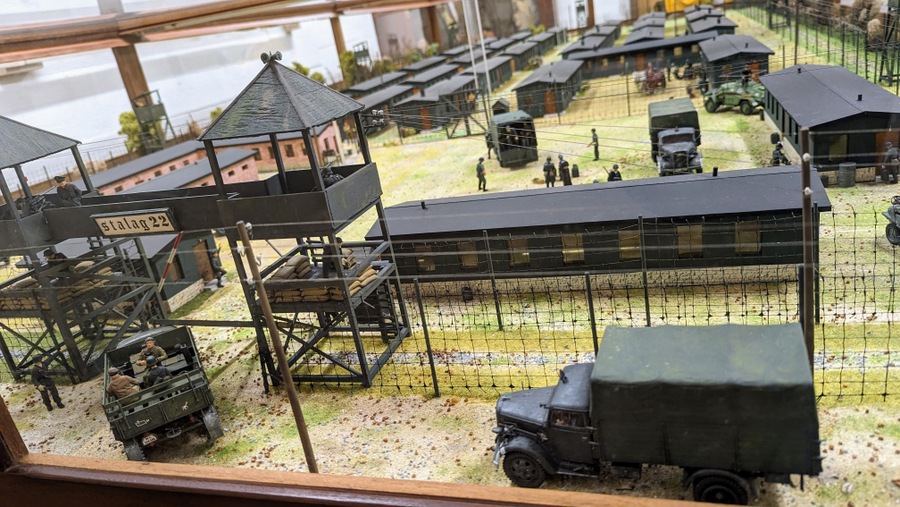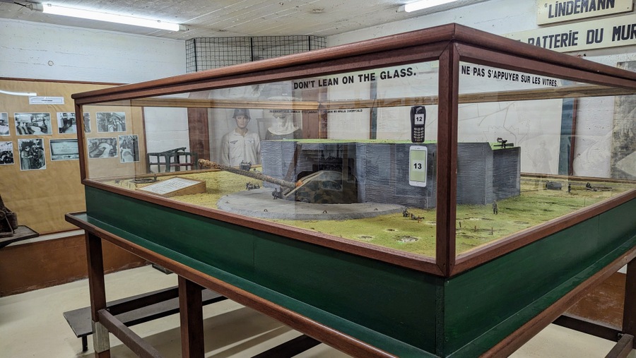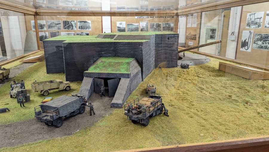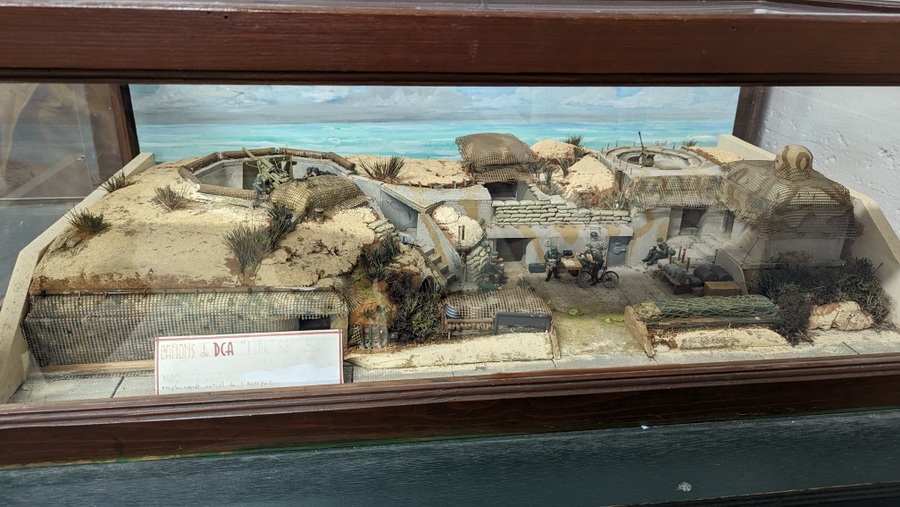 In the POW room there’s a full size table model of a POW camp, Stalag 22. And in the Batterie Lindemann room, a detailed model of one of the three casemates of the huge German battery on the hill outside nearby Sangatte. The three 406mm naval guns could easily reach parts of Kent. It’s no longer there. The corner of one of the outlying bunkers on the site can be seen, but the three gun casemates were buried under a small lake, in the waste soil from Eurotunnel.