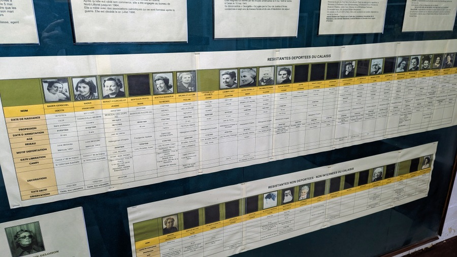 In the Women at War Room, there, covering the walls are details of courageous women in the Résistance in the Calais area. One interesting table records women who were deported. It shows why they were sent to the camps – Eg. for hiding escaped prisoners, distributing anti-German propaganda, or being denounced as a Jew – and if they survived the war, what happened to them.