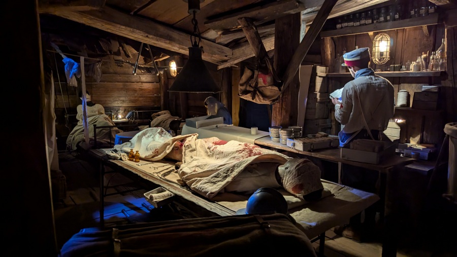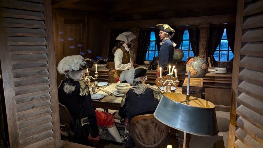 What’s clever about these experiences, is that the characters are a mix of animatronic & passive mannequins, with live actors. Sometimes it’s not easy to tell which is which. For example the Captain’s cabin on La Pérouse has four characters in it and I’m not sure which are the dummies! Apparently the cast double up roles, so the officer who chats to you in the galley of La Pérouse might also be the soldier who runs past you shouting “alarm!” in the trenches of Verdun later in the day.