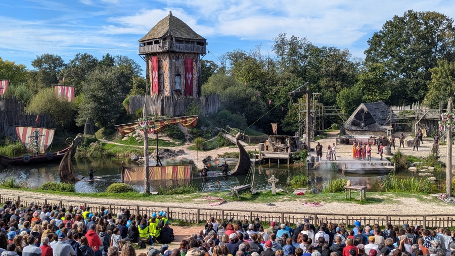 The 500 acre park in the Vendée region of France, packed with extraordinary attractions, refers to itself as a historical ‘theme park’ with period villages and hotels, but it has no rides** – no roller-coasters or vertigo-inducing thrill rides. It might be more accurate to describe it as a historical ‘scene park’, because what it does have is a collection of around twenty visually and technologically stunning shows on huge sets, covering history from Roman times to the 20th century, from a local and national perspective.