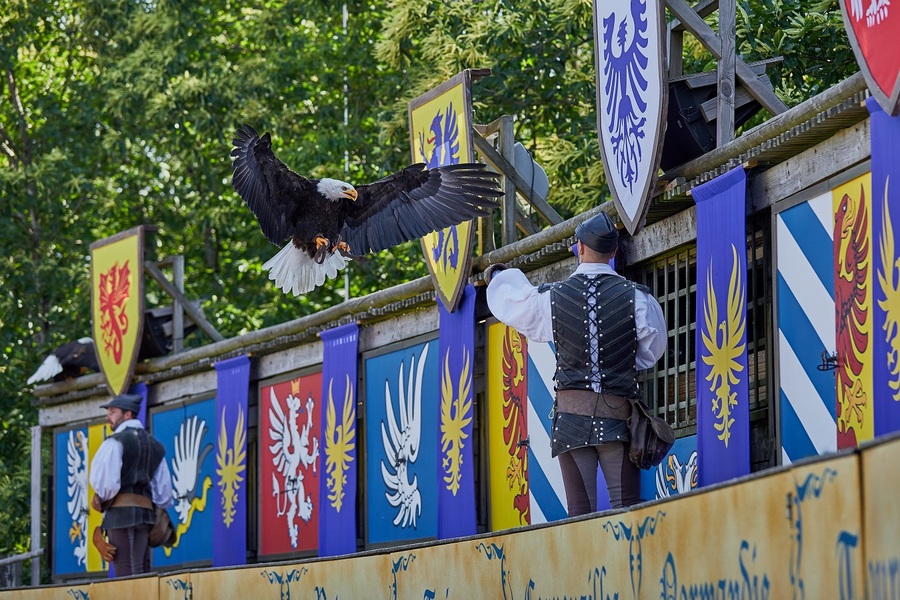 One of Puy du Fou’s most popular shows set in a large amphitheatre with some castle ruins. The storyline (memories of a princess who lived in the castle with her birds, are brought to life with a spell) is simply a vehicle for an amazing display of falconry, featuring some 330 birds of prey, including eagles, falcons, owls, vultures, spoonbills, a marabou stork, and a secretary bird. It’s thrilling to have some of these giant birds swooping low over your head, under the control and guidance of 30+ professional falconers.