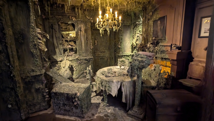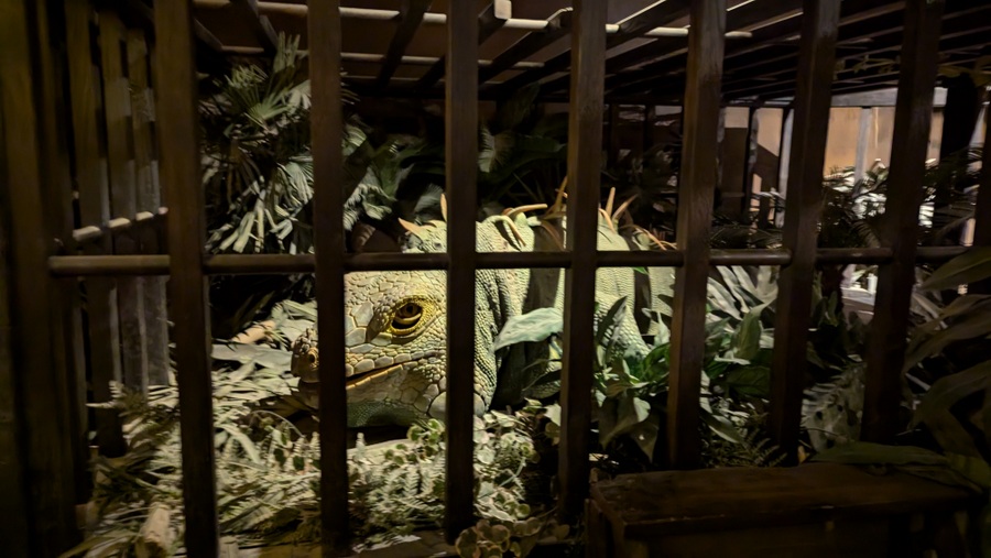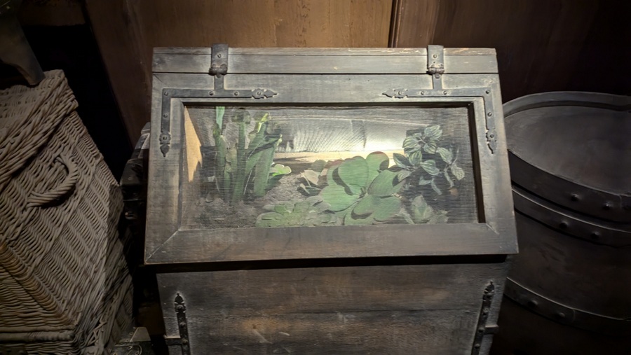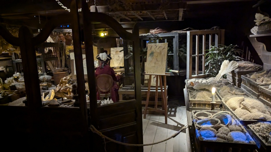 The trail takes visitors through his study, the dockside where provisions were bought and loaded and then through the lower decks of his ship, crammed with provisions. As the voyage gets underway, the ship begins to fill with the exotic flora and fauna he and his men collected on the way. Before long the ship begins roll in heavy seas. Luckily for us, the effect is re-created by a rolling hull – the walls and ceiling – synchronised with views of stormy seas through the portholes and gun ports, and the occasional deluge of water… so no seasick pills needed! Live actors supplement the mannequins & animatronics as officers and crew, and the last poignant scene is a silted and decaying cabin on the ocean floor.