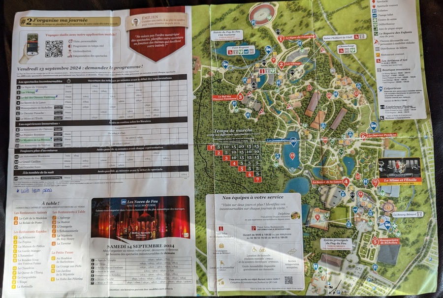 Puy du Fou is huge and confusing… and French (there’s not much English signage around)! Every visitor gets a map*** with a mass of detail on show schedules, eateries, and other points of interest.