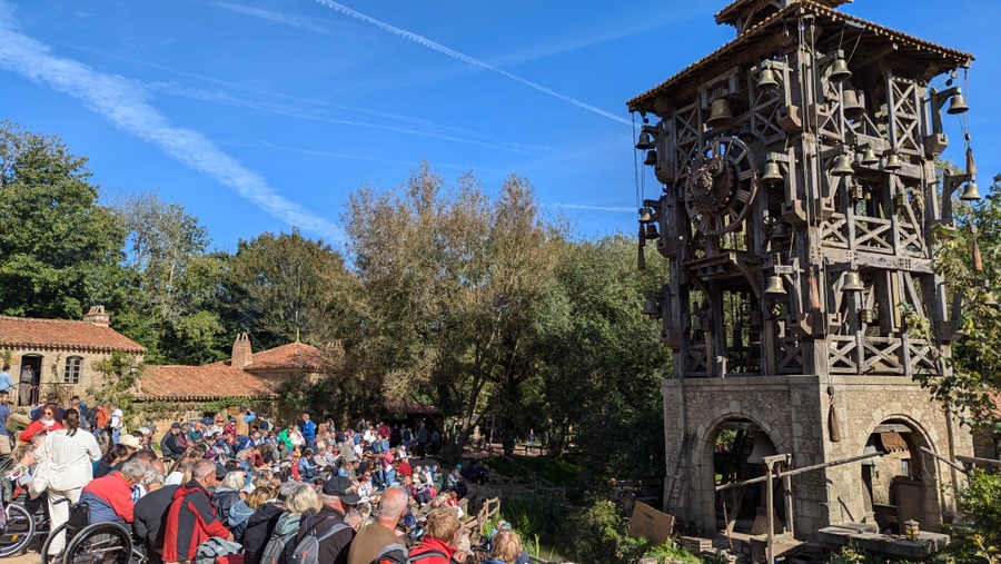 - Chasseloup (18th century) has a leatherworker, glassmaker, earthenware maker, a bookbinder and gilder, a sadler and an illuminator, who decorates and illustrates texts on parchments, all making and selling their wares. In addition, one of the park’s two performance restaurants, Le Relais de Poste, is here, where the waiters/performers encourage much singing and carousing, and an 16-metre high Grand Carillion (bell tower) in the centre of the village puts on a 10 minute performance of bell-ringing and acrobatics five times a day.
