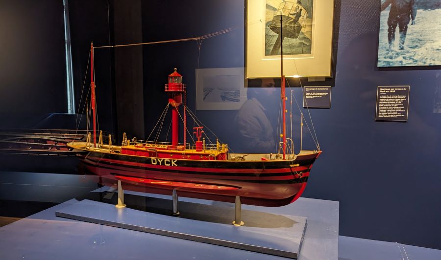 The bright red Sandettié lightship rather stands out on the quayside, but that was her job. She was permanently moored, with her powerful lantern, foghorn and bright red hull, from 1949 to 1989 to mark the sandbanks off Dunkirk. Actually, her real name is Bateau Feu 6 (BF6) and her first location was on the Dyck sandbank. Her hull name was changed to Sandettié when she was reassigned to the Sandettié sandbank. While on station she had a crew of eight men whose job it was to keep her in good working order, to take and report weather data, and to monitor passing ships.