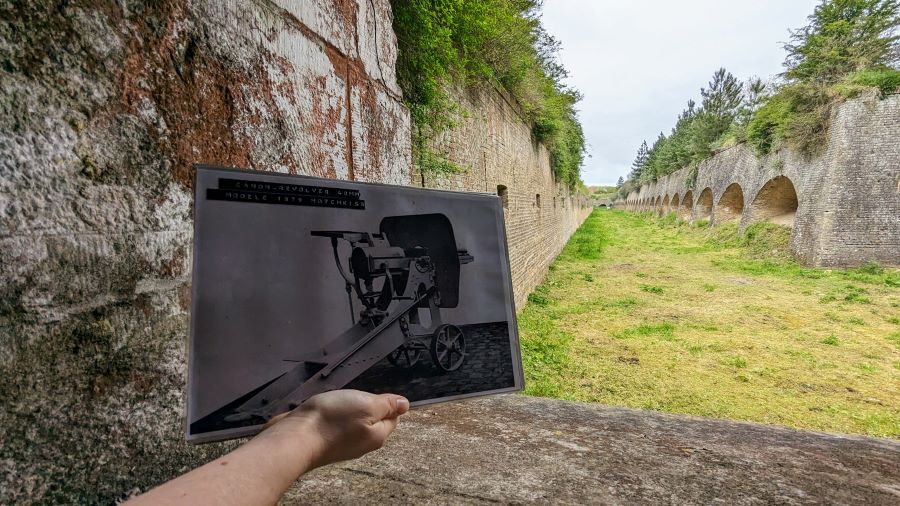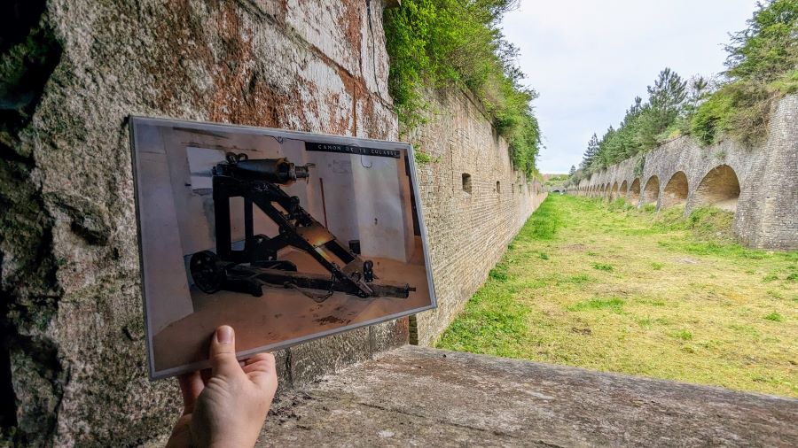 This featured an upgrade from the old 17th century fortress design of open topped outworks (‘lunettes’) – protrusions looking down on the enemy. Instead, covered ‘caponiers’ protruded into the dry moat enabling enfilading fire along the moat.